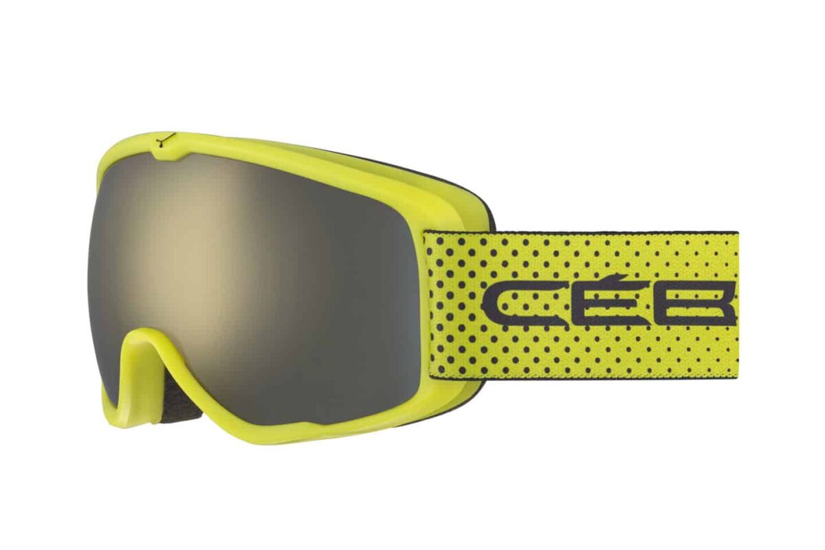 Junior Μάσκα Ski – Snowboard με lime ματ πλαίσιο, γκρι – χρυσό καθρέφτη φακό DARK GREY FLASH GOLD, ΚΑΤ.3 και lime ελαστικό ιμάντα με μαύρα μικρά “dots” και γκρι λογότυπο CEBE.