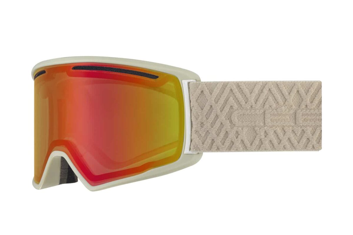 Μάσκα Ski – Snowboard με μπεζ ματ πλαίσιο, φωτοχρωμικό, κίτρινο-κόκκινο, καθρέφτη φακό PC VARIO PERFO AMBER FLASH RED, ΚΑΤ. 1-3 και μπεζ ελαστικό ιμάντα με αναγλυφες γραμμές και λευκό λογότυπο CEBE.