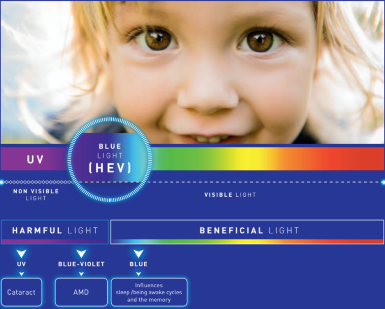 Ονομάζεται επίσης και ακτινοβολία HEV (High-Energy Visible), η μπλε ακτινοβολία είναι το φως με τις υψηλότερες συχνότητες στο ορατό φάσμα. Η HEV προκαλεί φωτοχημικές βλάβες στα κύτταρα του αμφιβληστροειδούς. Αυτή η αλλοίωση των κυττάρων του αμφιβληστροειδή προκαλεί καταρράκτη και αλλοιώσεις στην ωχρά κηλίδα που σχετίζονται με την ηλικία καθώς και εκφυλισμό (AMD ή ARMD) που οδηγεί σε σημαντική απώλεια όρασης.